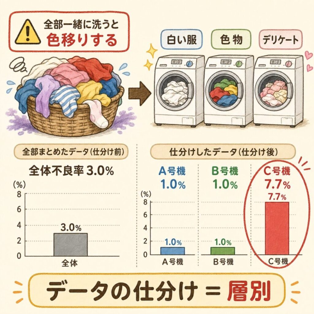層別とは データを「共通の特徴」でグループ分けすること。全体平均に隠れた真犯人を見つけ出す