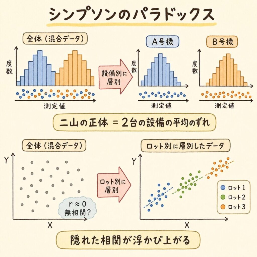 この現象は統計学で「シンプソンのパラドックス」と呼ばれます。全体のデータで見たときの傾向と、グループ別に分けて見たときの傾向が逆転することがある、という恐ろしい現象です。層別しなければ、正しいデータを持っていても間違った結論を出してしまうことがある。だから層別は品質管理の「土台」なのです。