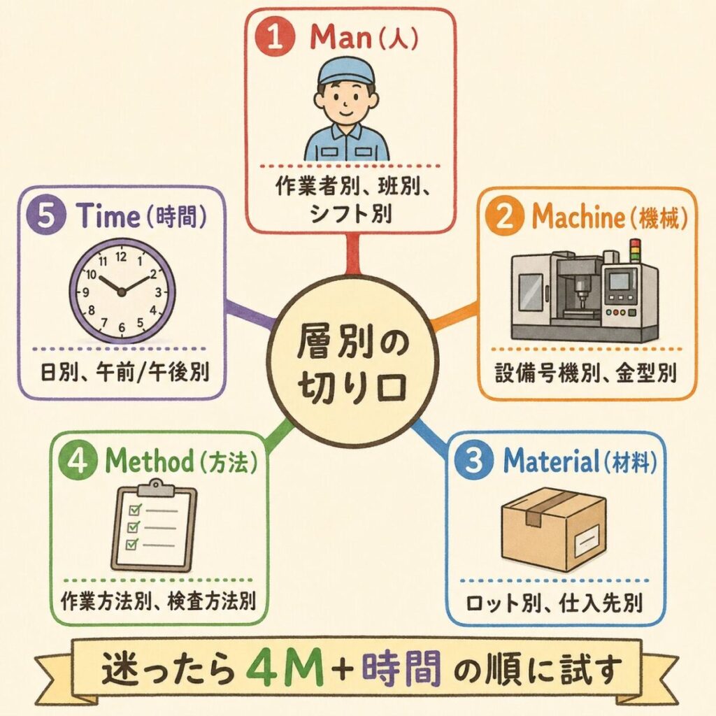 層別するとき、「何で分ければいいんだろう」と迷う人が多いです。答えはシンプルで、製造業では4M(人・機械・材料・方法)+ 時間の5つの切り口で分ければ、ほぼすべてのケースをカバーできます。