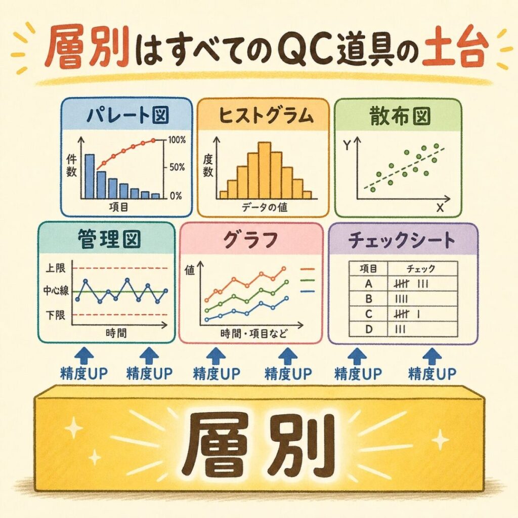 QC7つ道具の中で、層別だけは「手法」ではなく「考え方」です。他の6つには「こう描く」「こう計算する」という手順がありますが、層別は「データを分けてから分析しよう」という思考法そのものです。だからこそ、他の6つすべてに適用でき、すべての分析の精度を底上げする「土台」になるのです。