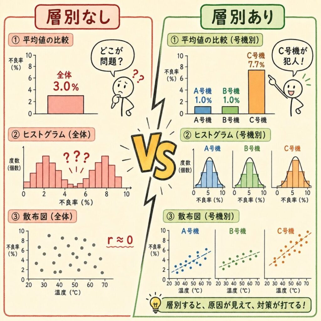 全体では3.0%だった不良率が、設備別に分けた瞬間に「C号機だけ7.7%」という真犯人が浮かび上がりました。A号機とB号機は問題なし。全体のデータだけ見ていたら、この事実は永遠に埋もれたままです。