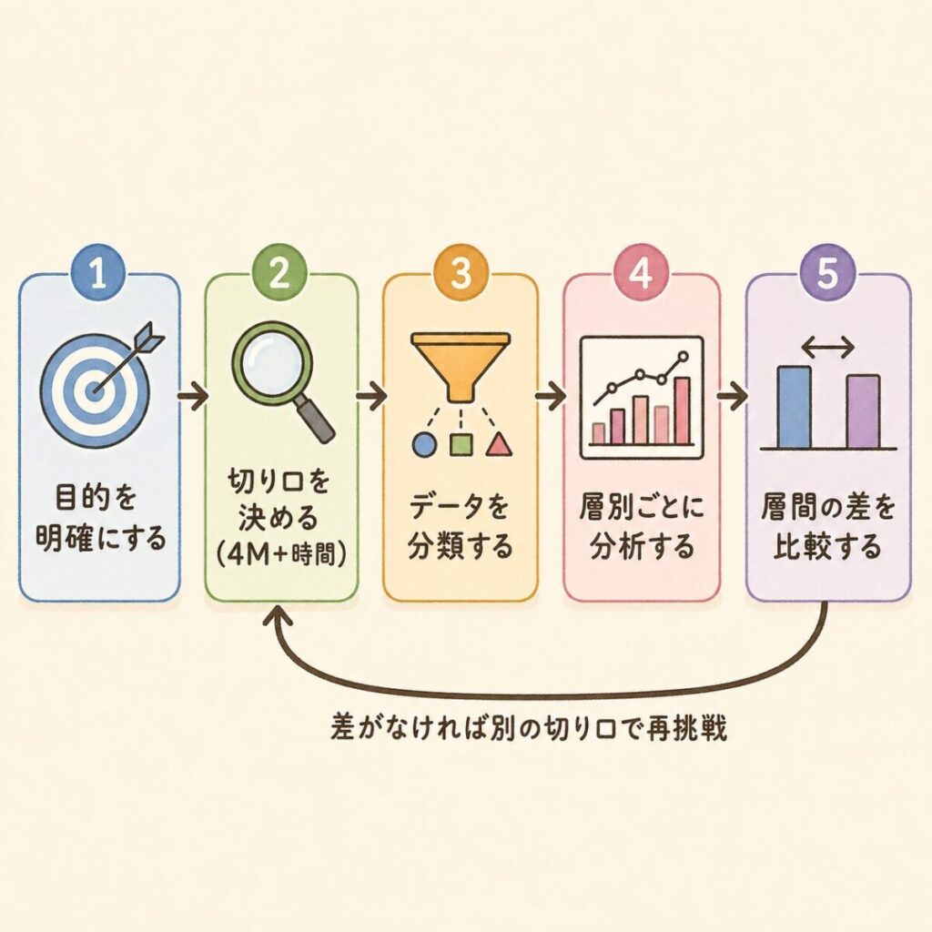 STEP 2〜5は繰り返しです。最初に選んだ切り口で差が見つからなければ、別の切り口で分ける。「人で分けて差がない→機械で分けても差がない→材料で分けたら差があった!」──このように仮説→検証のサイクルを回すのが層別の正しい進め方です。