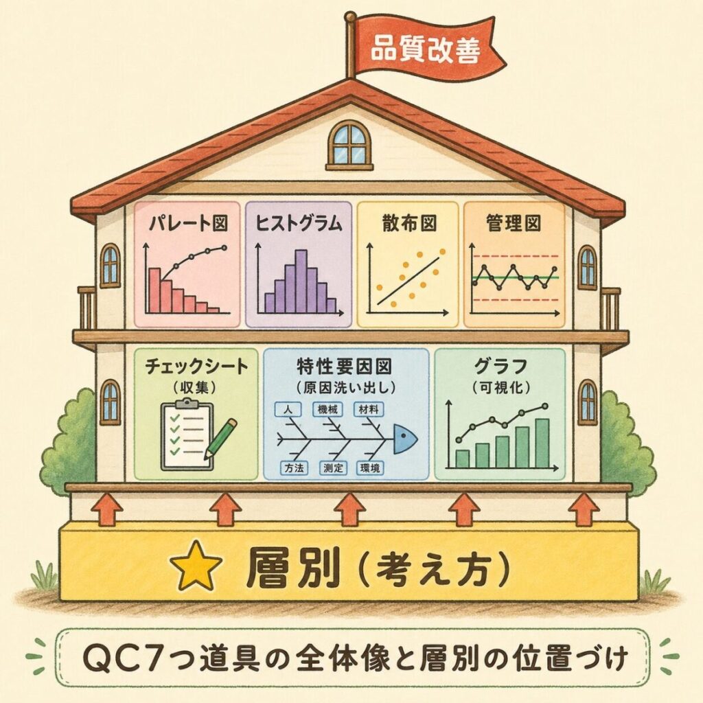 最後に、QC7つ道具の全体像の中で層別がどの位置にいるかを整理します。