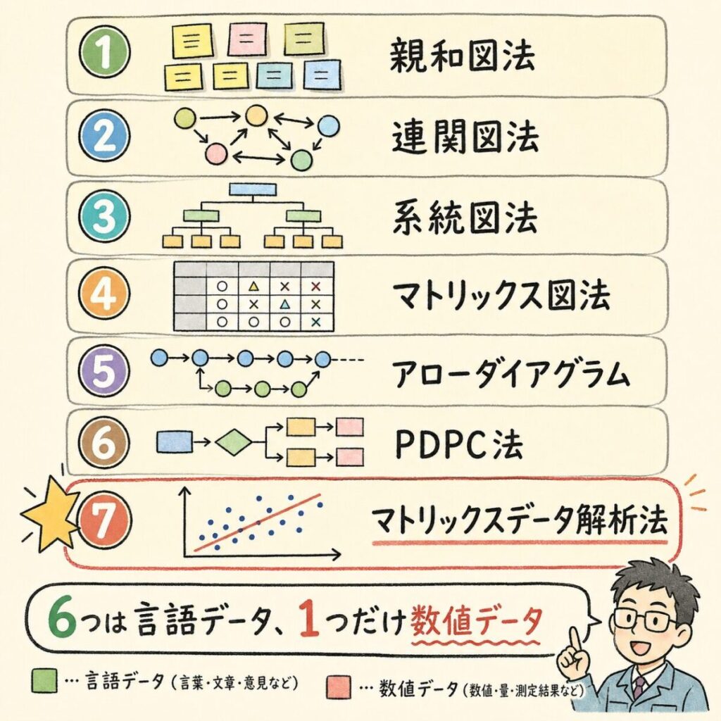 7つのうち6つは「言語データ」を図にする手法です。唯一の例外が❼マトリックスデータ解析法で、これだけが「数値データ」を主成分分析で数学的に解析します。QC検定では「新QC7つ道具で唯一の数値解析手法は?」という問題がよく出ます。