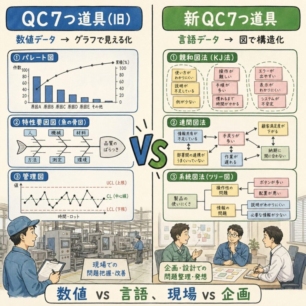 QC7つ道具(パレート図、特性要因図、管理図など)は、数値データをグラフや図にして問題を見える化する手法群です。工場の現場で「不良率が何%」「寸法の平均が何mm」といった数値を扱うのが得意です。