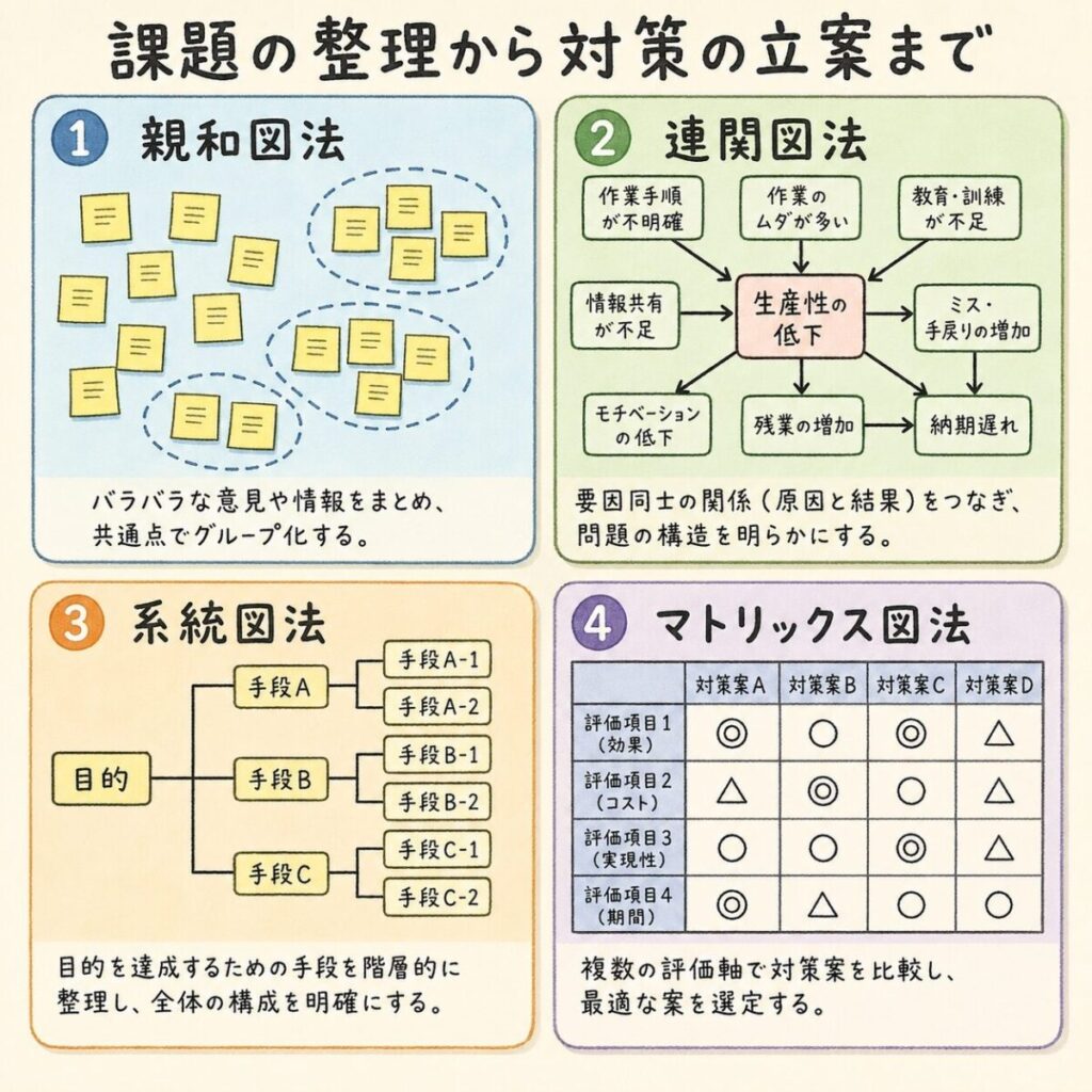 | ❶ | 親和図法 | グルーピング | バラバラな意見・データを「仲間分け」して全体像をつかむ |