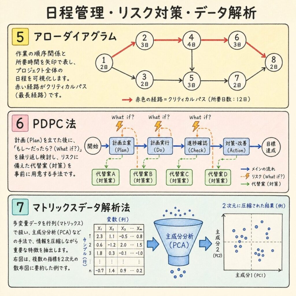 | ❺ | アローダイアグラム | 日程管理 | 作業の順序と所要時間を矢印で表し、最短工期を求める |