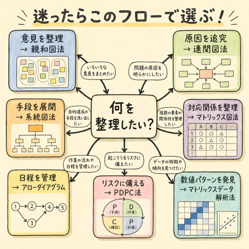 新QC7つ道具は、この「言葉の情報」を整理・構造化するために生まれた手法群です。この記事では、7つの手法の全体像から使い分けまで、図解で徹底的に解説します。