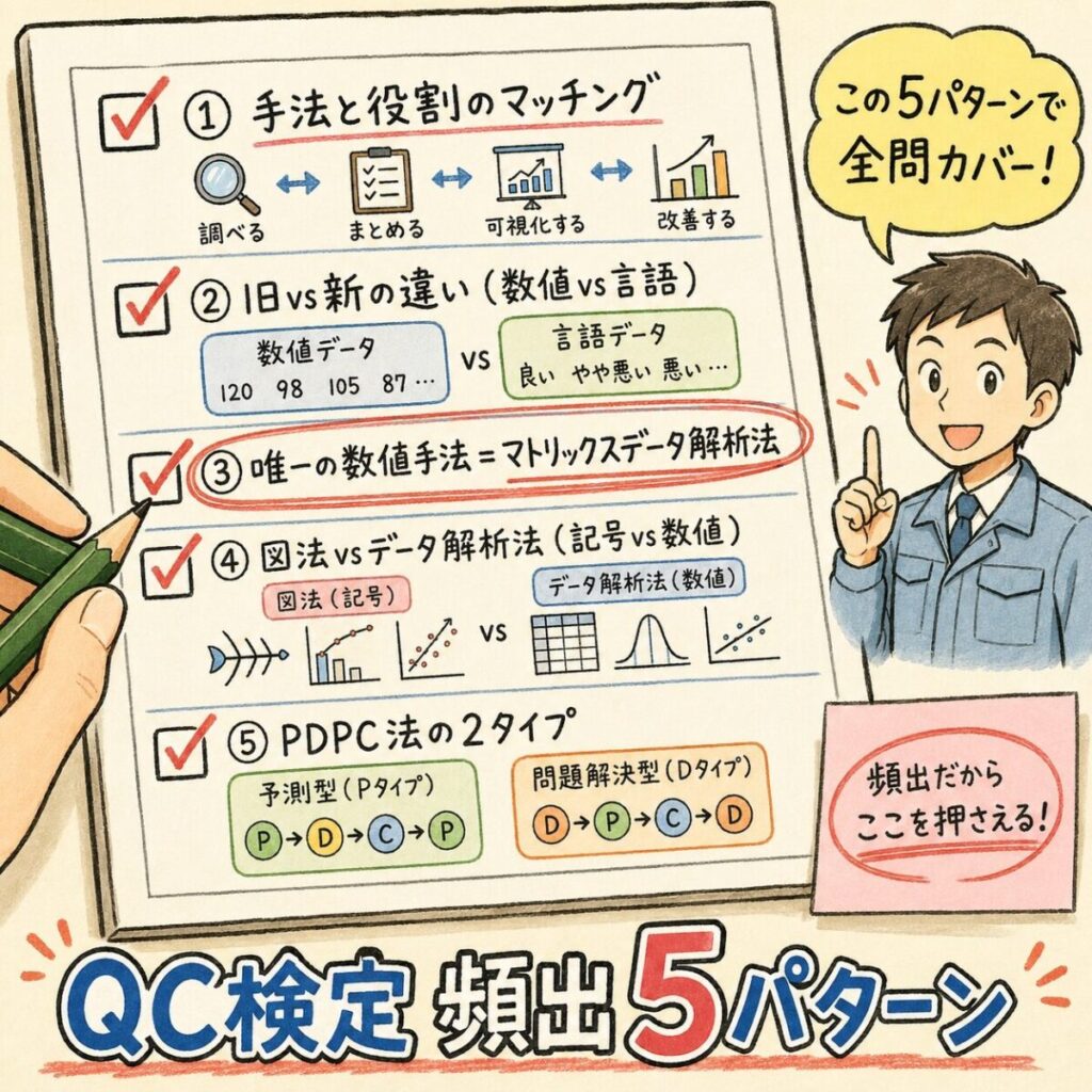 新QC7つ道具はQC検定2級・3級で毎回のように出題されます。計算問題は出ません。以下の5パターンを確実に押さえてください。