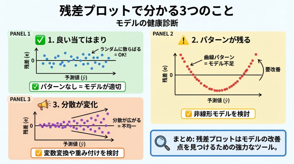 • 残差プロットでパターン・分散・外れ値をチェックすれば、モデルの問題点が見える