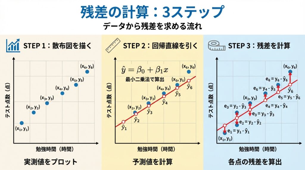 それでは、残差がどうやって生まれるのかを、具体例を使って3ステップで見ていきましょう。