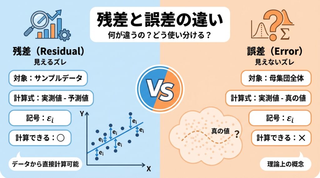 【完全図解】残差と誤差の違い|見えるズレと見えないズレを徹底解説