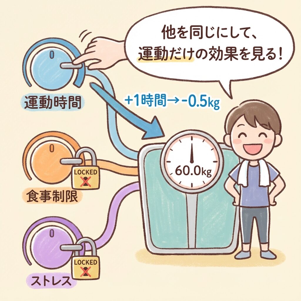 偏回帰係数なら、「食事制限を同じにしても、運動だけで0.5kg痩せる」という純粋な運動の効果がわかるのです。