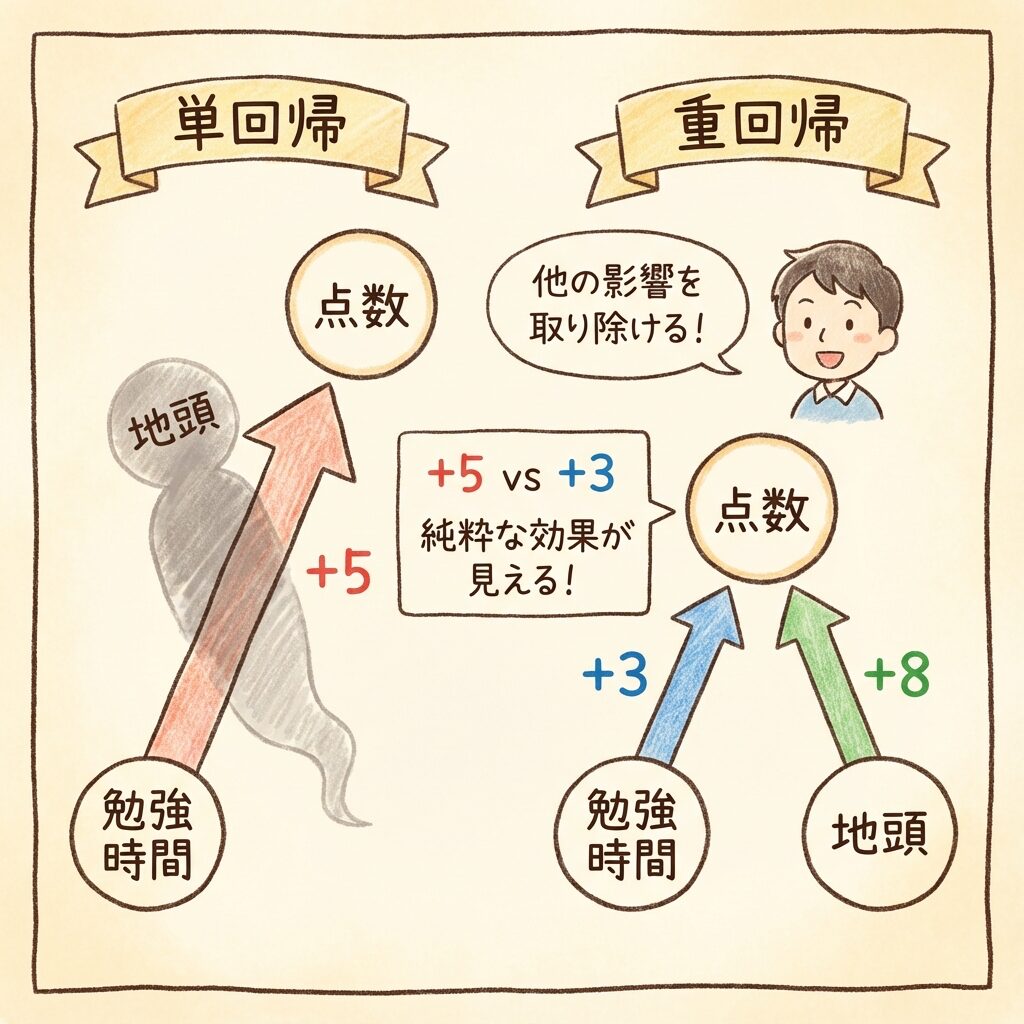 単回帰では「+5」だった勉強時間の効果が、重回帰では「+3」に減りました。