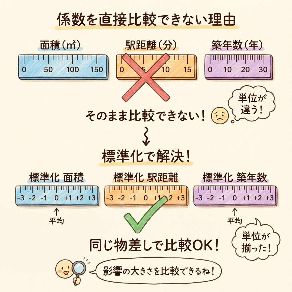標準化すれば、「面積の標準化係数が0.6、駅距離が−0.3だから、面積の方が2倍影響力がある」と言えます。