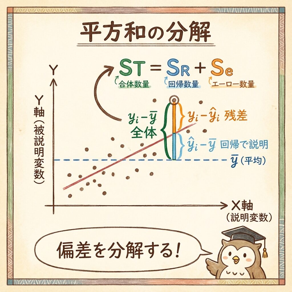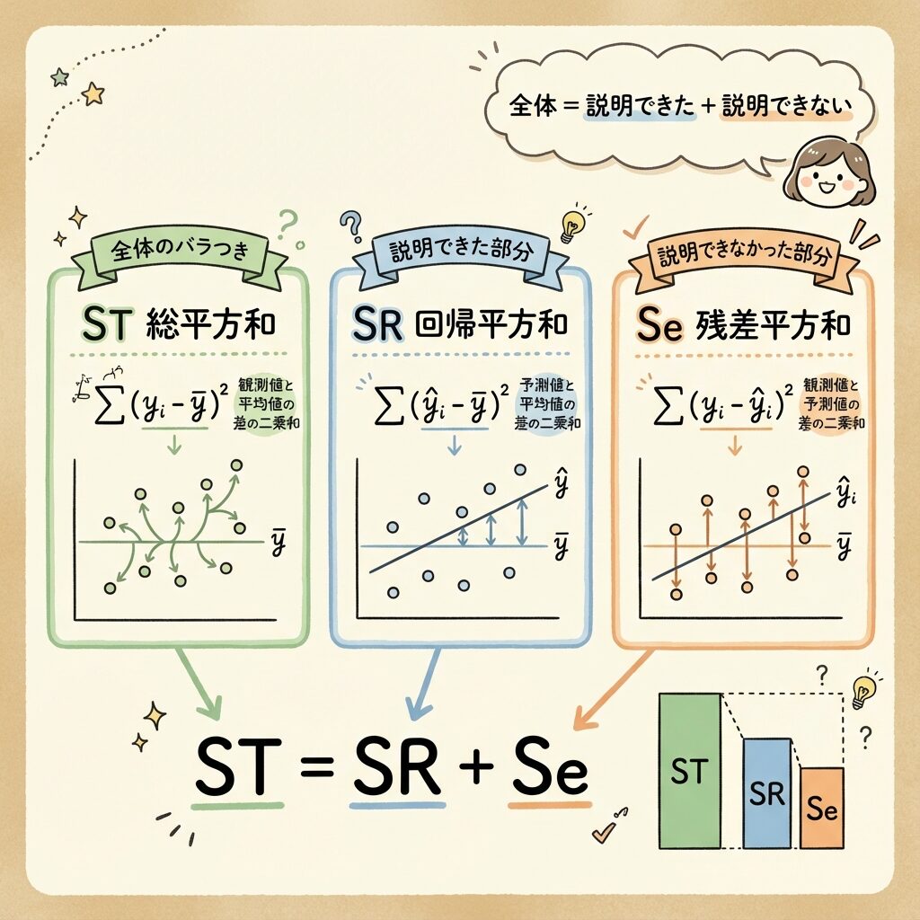 つまり、yのバラつき全体(ST)を、「回帰で説明できた部分(SR)」と「説明できなかった部分(Se)」に分けるのです。