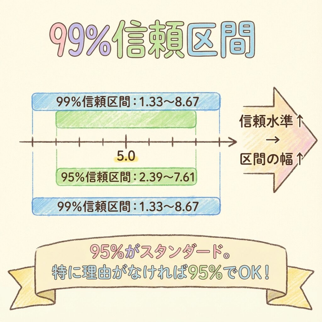 信頼水準を95%から99%に上げると、区間の幅が約1.4倍に広がりました。