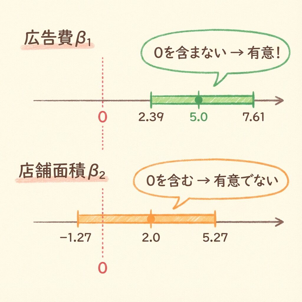 | 広告費 x₁ | 2.39 〜 7.61 | 含まない | 有意 ✓ |