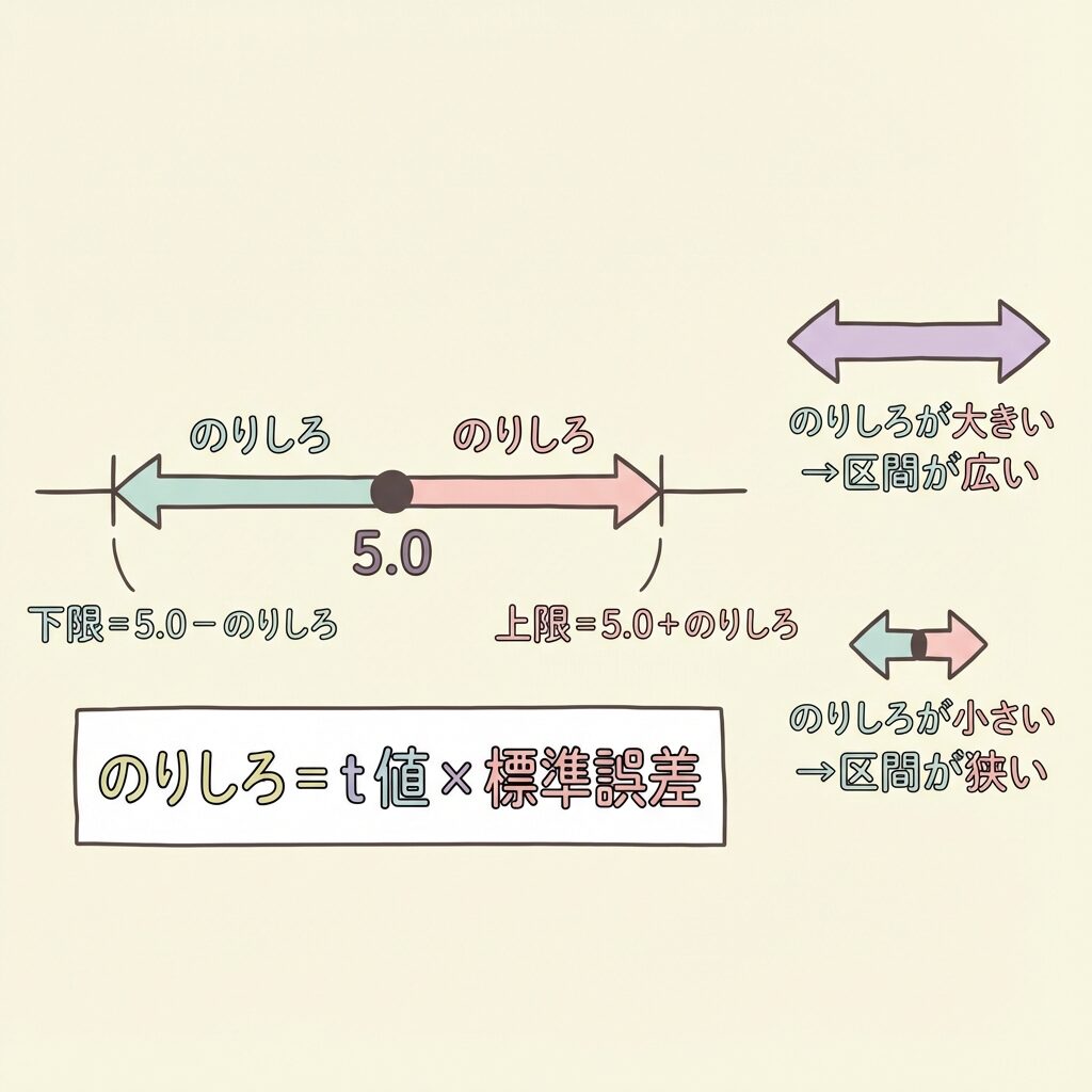 | t値 (信頼水準で決まる) | 信頼水準が高い(99%など) → 区間が広がる | 信頼水準が低い(90%など) → 区間が狭まる |