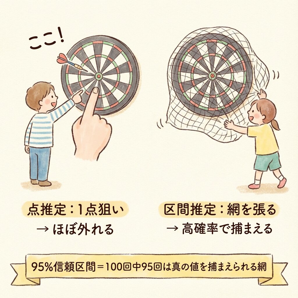 区間推定:「的の中心はこの範囲にある」と網を張る → 高確率で当たる