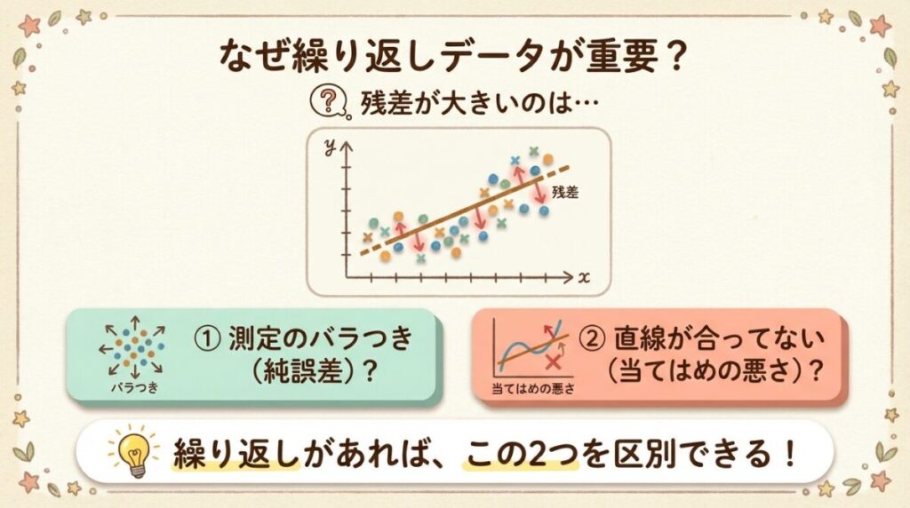 実験データでは、同じxの値で複数回測定することがよくあります。この「繰り返しデータ」を活用すると、通常の回帰分析では見えなかった情報が得られます。