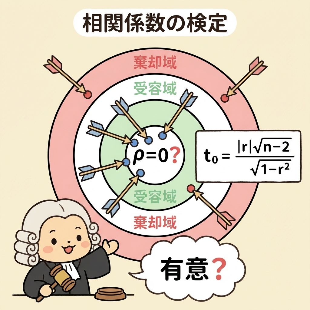 • 相関係数の検定:t₀ = |r|√(n−2) / √(1−r²)