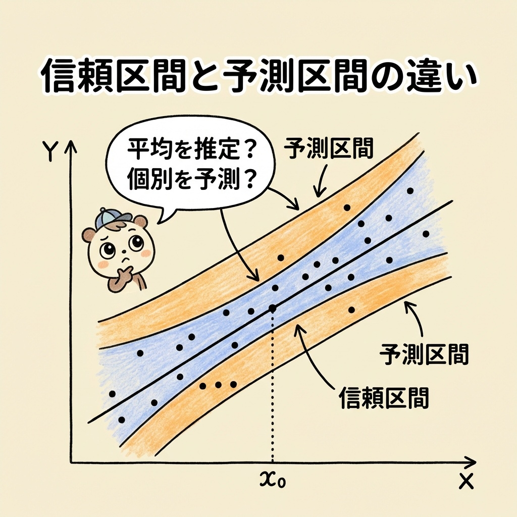 • 信頼区間と予測区間:平均の推定か、個別の推定かで使い分け