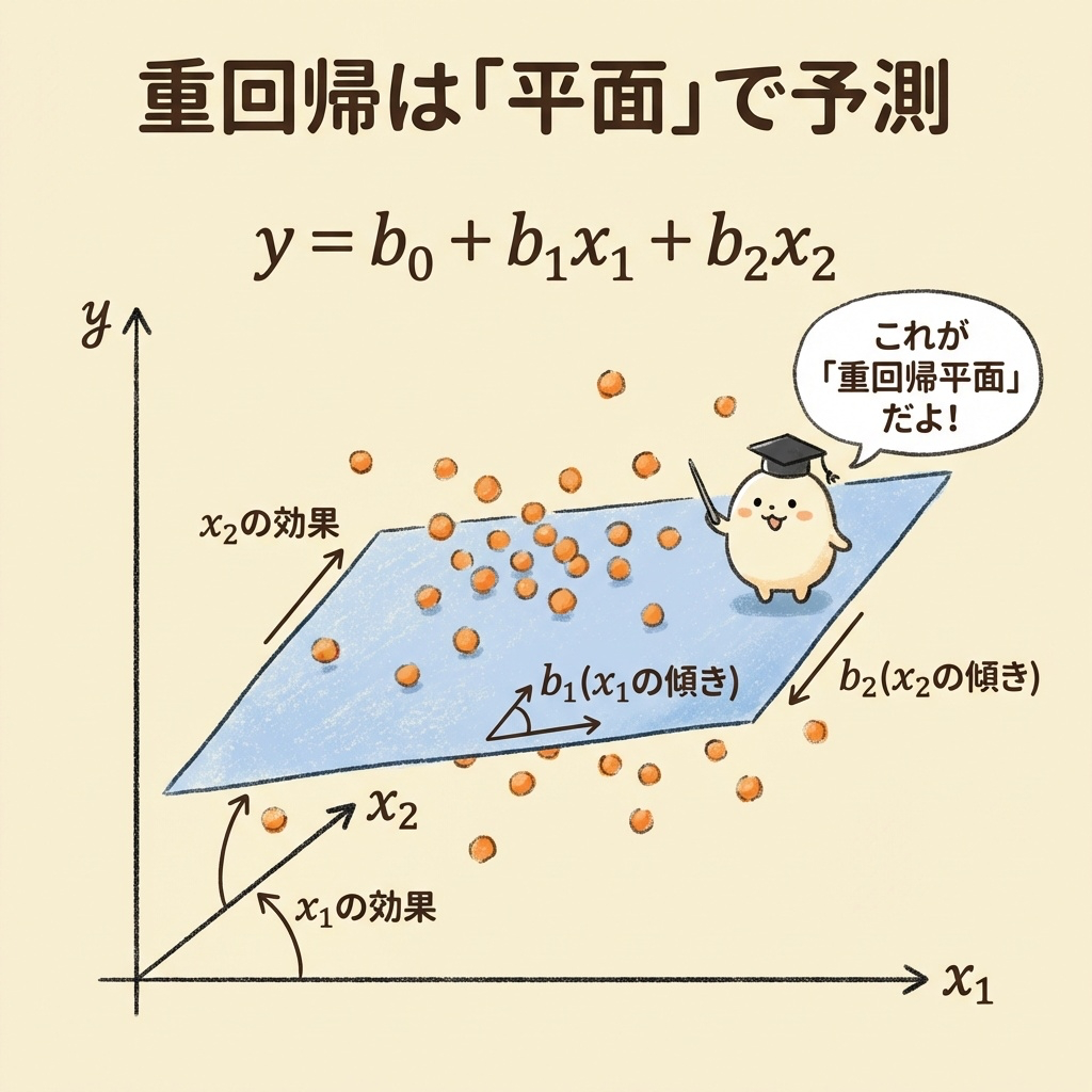 偏回帰係数 b₁ は「x₂を固定したとき、x₁が1増えるとyがb₁増える」という意味です。単回帰の傾きとは違い、「他の変数の影響を取り除いた純粋な効果」を表します。