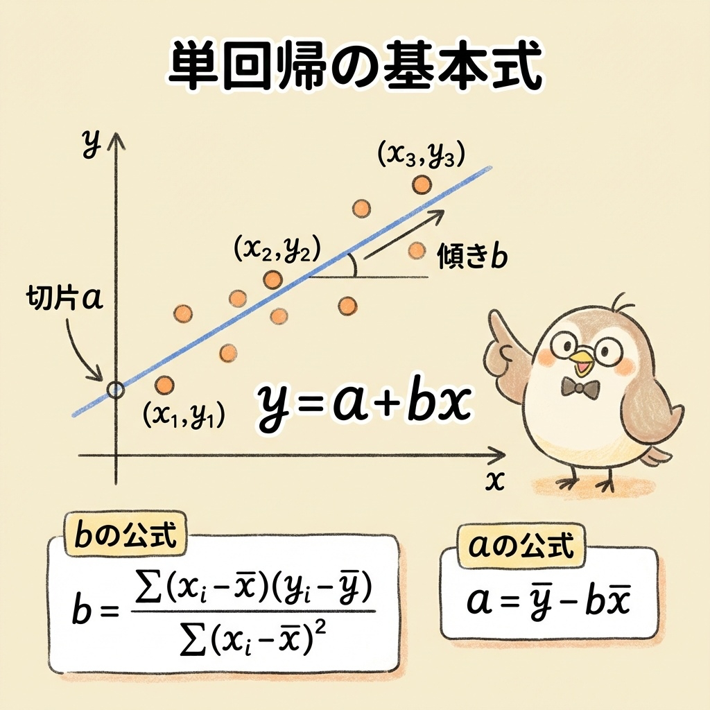 • 単回帰の基本式:ŷ = a + bx、傾き b = Sxy/Sxx、切片 a = ȳ − bx̄