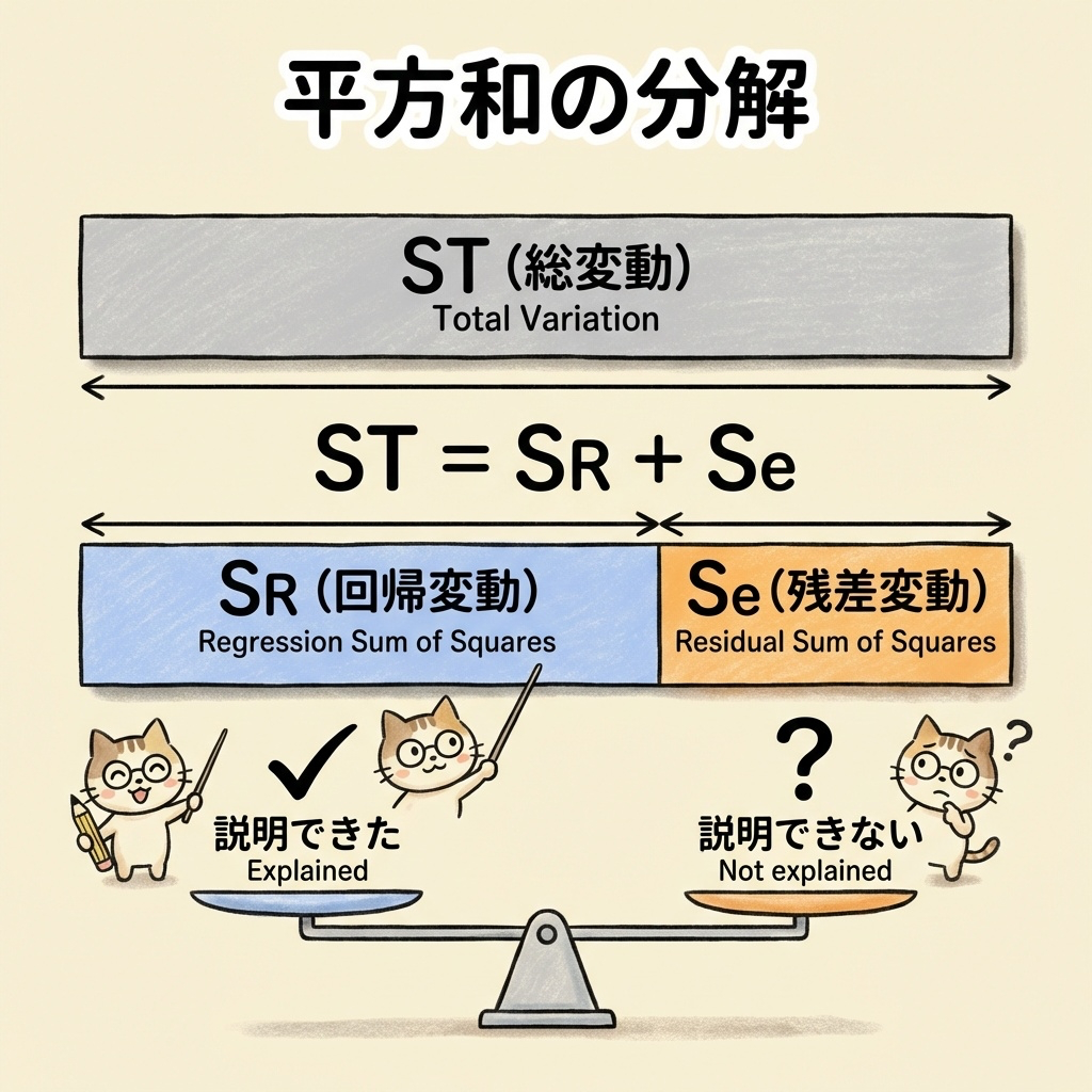 • 平方和の分解:ST = SR + Se(全体 = 説明できた + 残差)