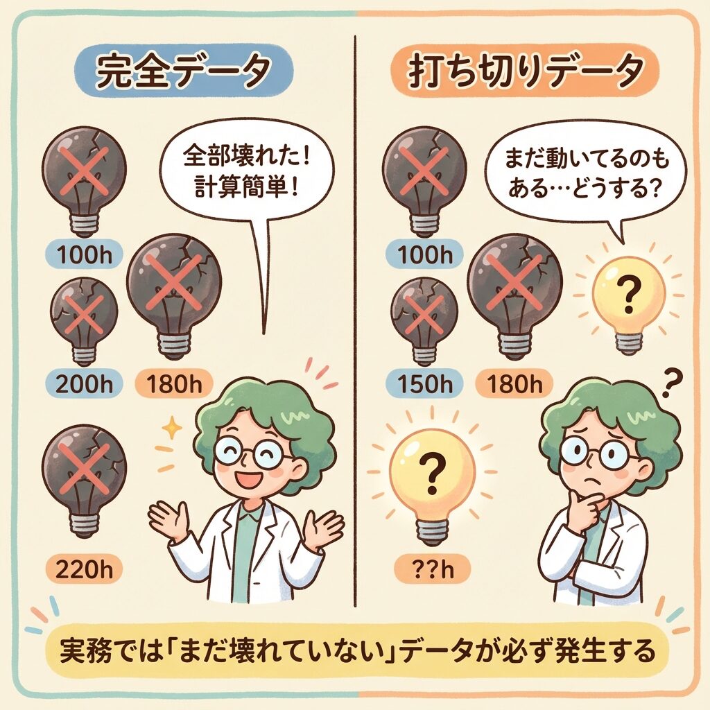打ち切りデータを無視すると、「長生きした優秀な製品」の情報が失われ、寿命を実際より短く見積もってしまいます。