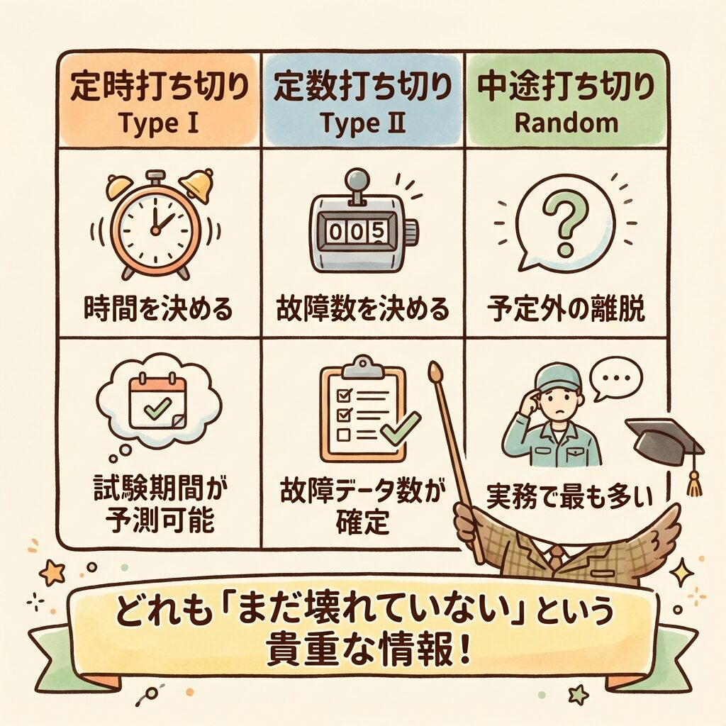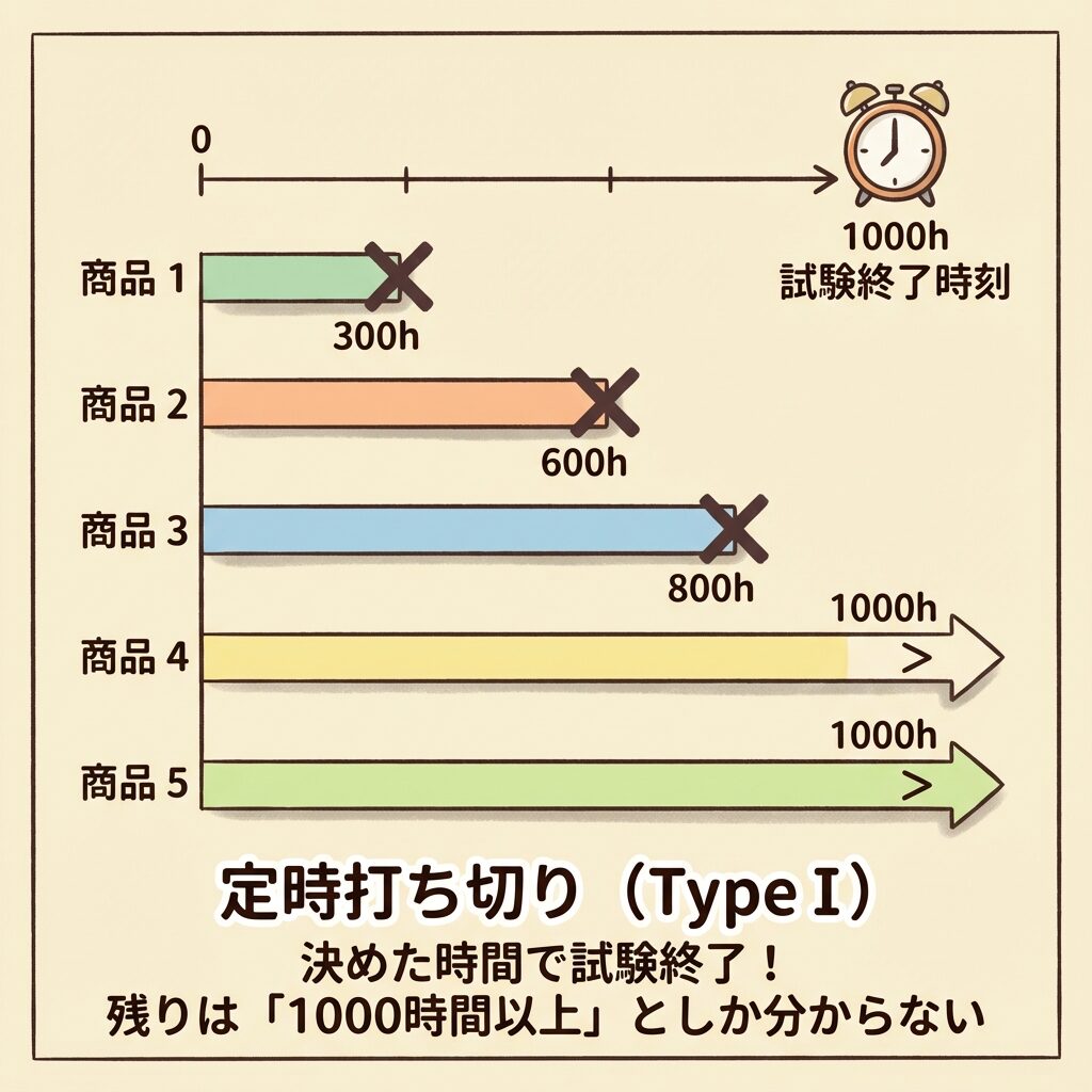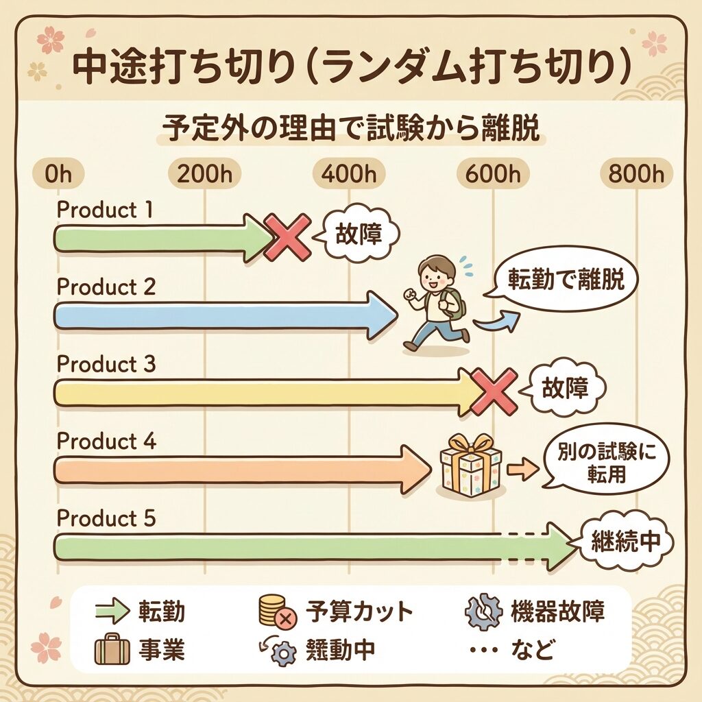 - 定時打ち切り(Type I):時間で終了、試験期間が確定