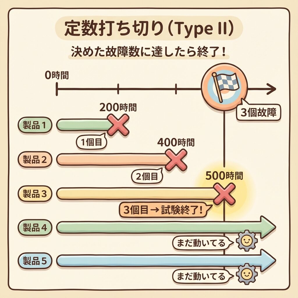 | 定数打ち切り | Type II | 決めた故障数 | 故障データ数が確定 |