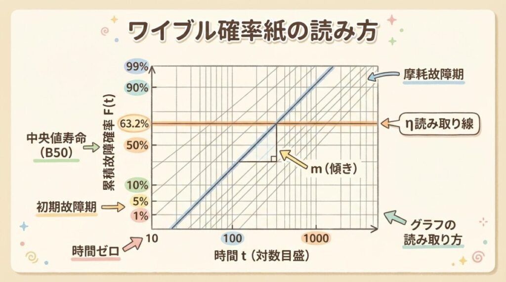 なぜ63.2%? → ワイブル分布でt=ηのとき、F(η) = 1 − 1/e ≈ 0.632 だから。
