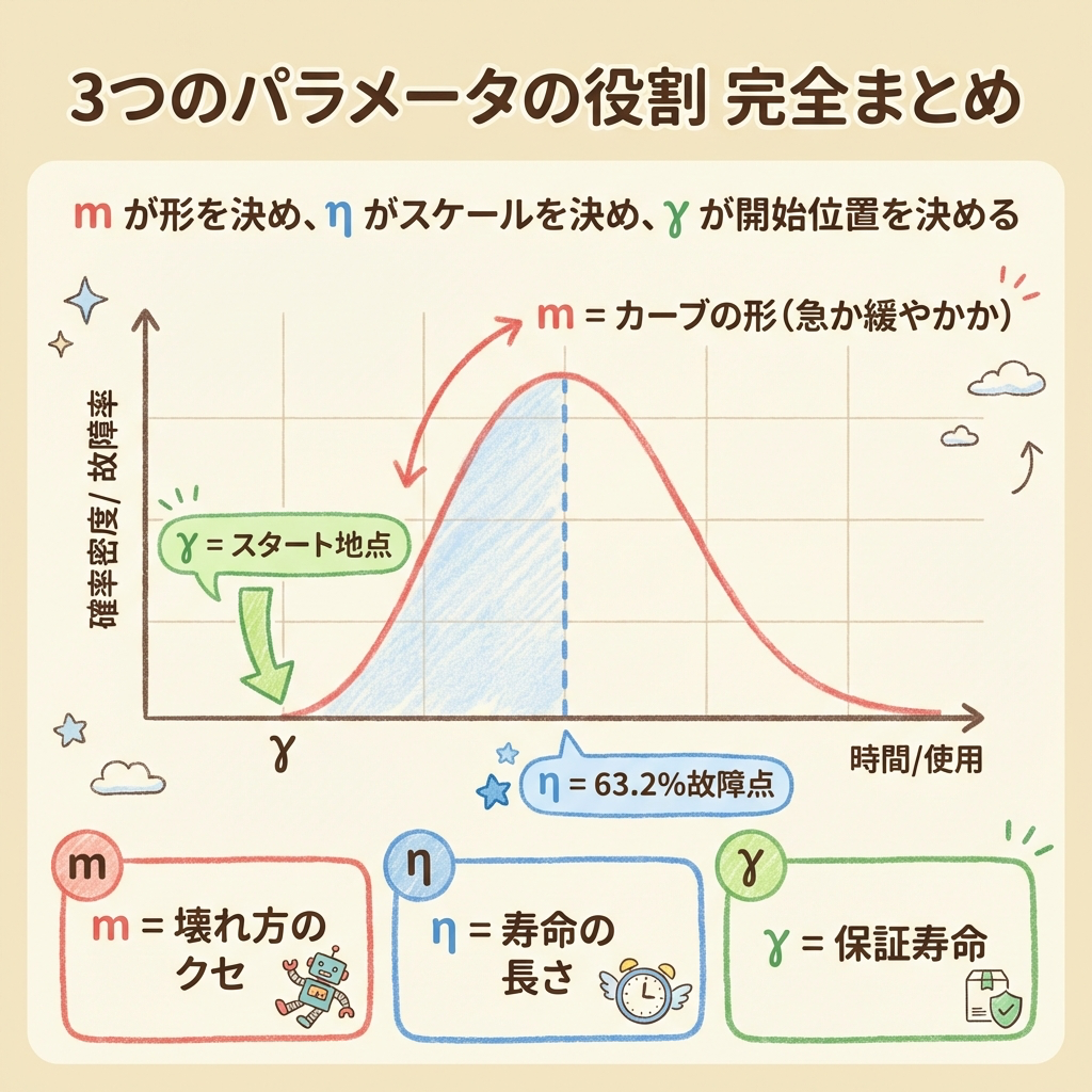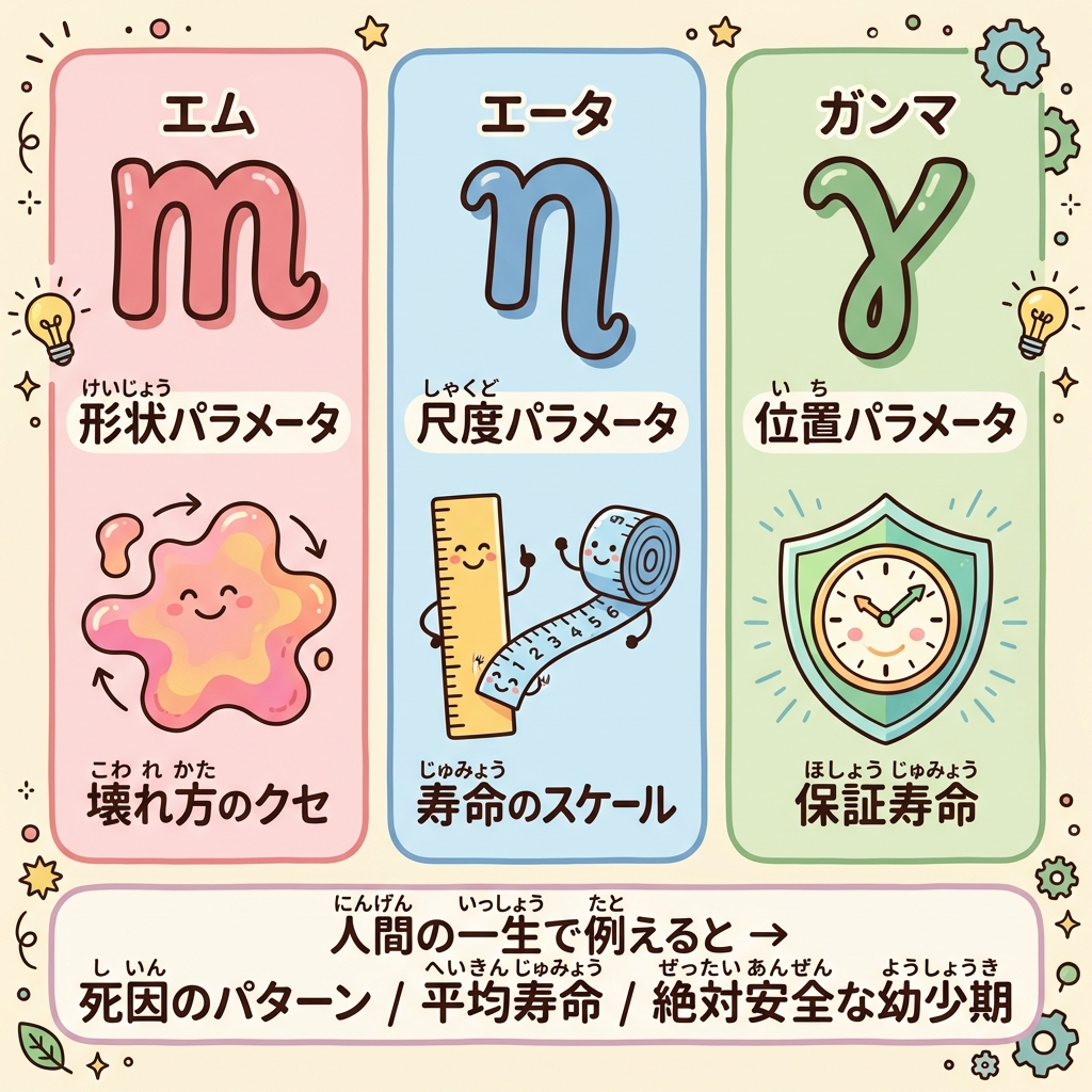 ワイブル分布の3つのパラメータは、最初は「暗号」のように見えますが、「人間の一生」に当てはめれば驚くほどスッキリ理解できます。m=死因のパターン、η=平均寿命、γ=絶対安全な幼少期。この3つで製品の「壊れ方の履歴書」が完成するのです。