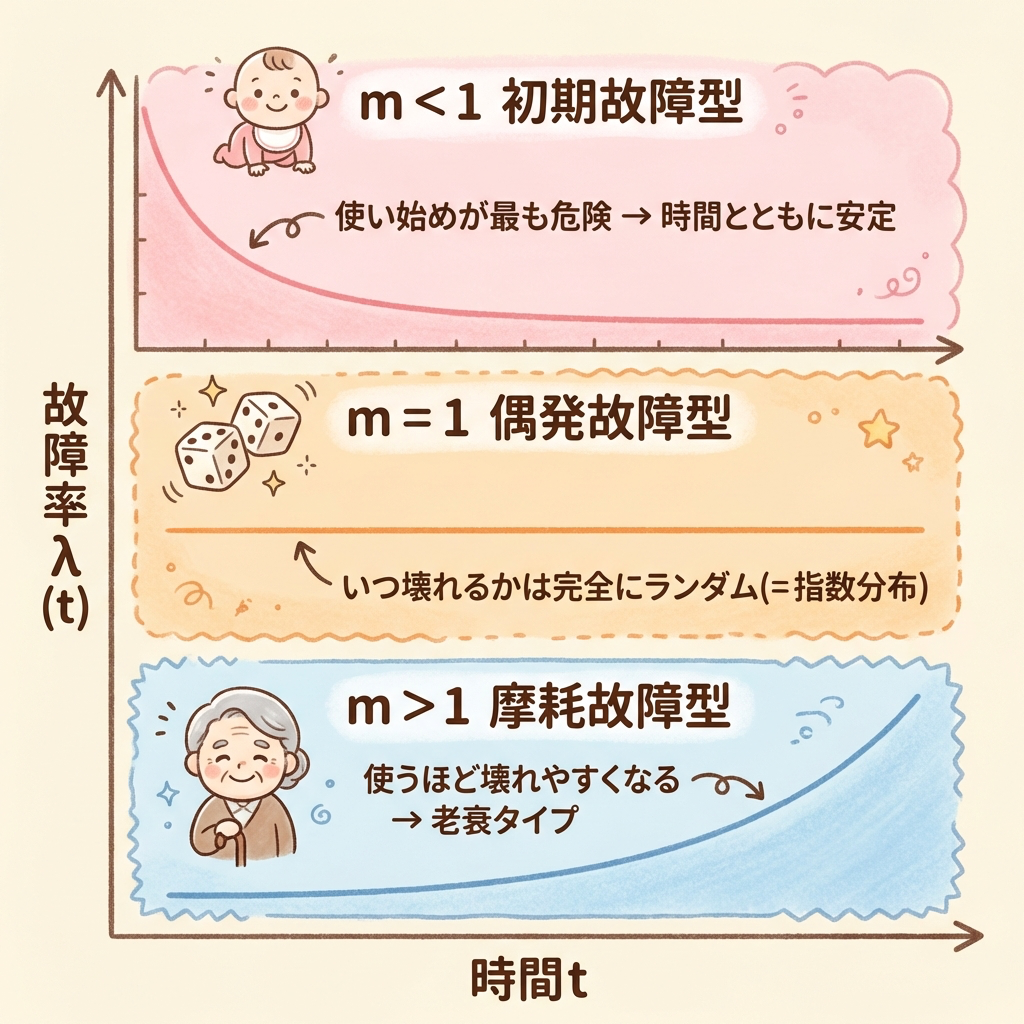 m<1・m=1・m>1の3パターンが、バスタブカーブの「初期故障期」「偶発故障期」「摩耗故障期」にそのまま対応します。
