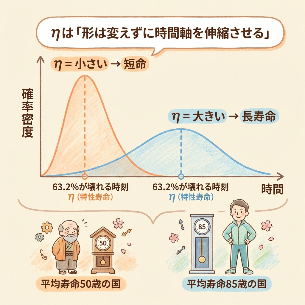- η(尺度パラメータ)=「寿命のスケール」。短命か長寿か