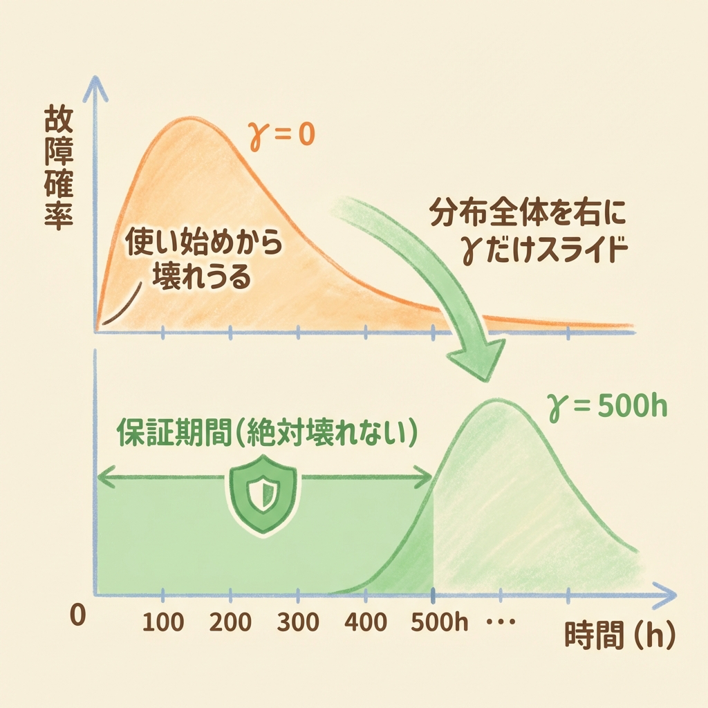 - γ(位置パラメータ)=壊れ始めの「スタート時刻」。γまでは故障確率ゼロ(保証寿命・最低寿命)