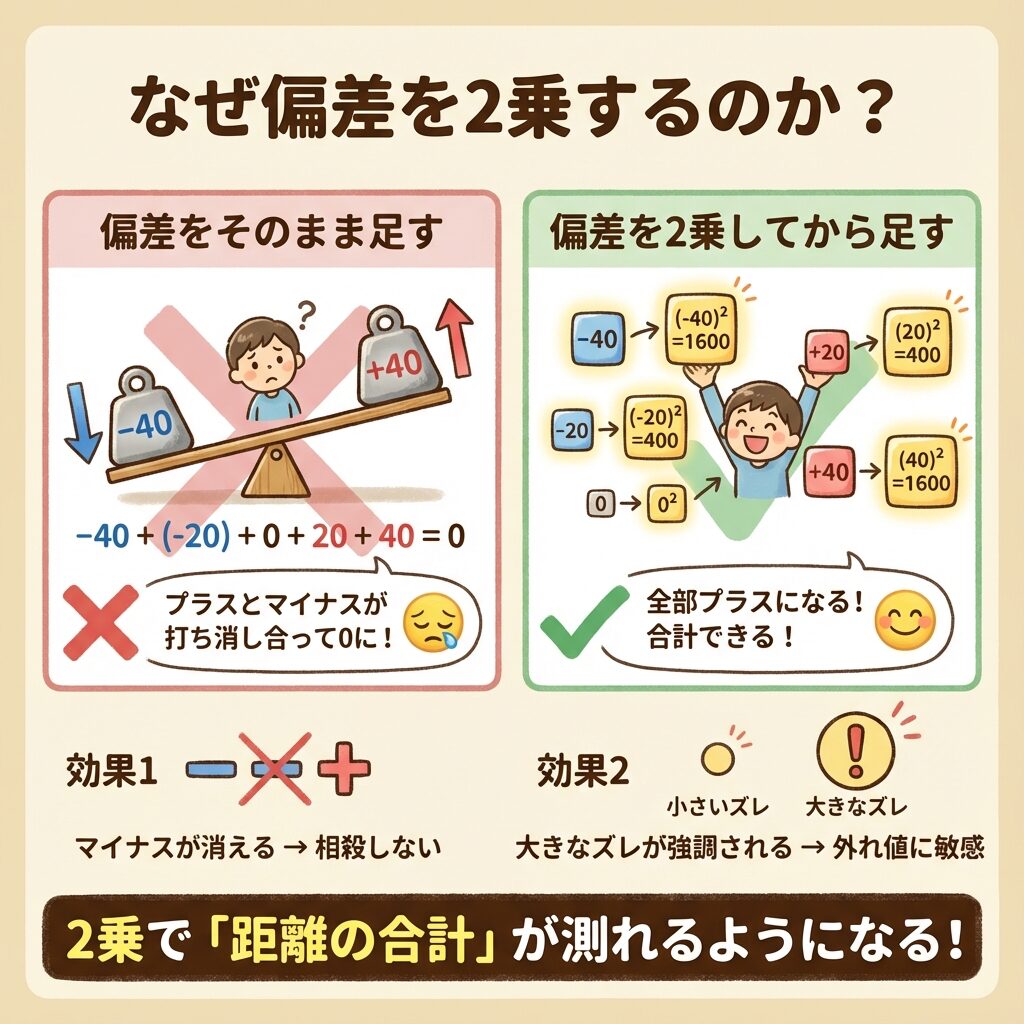 - 偏差を2乗する理由=プラスマイナスの相殺を防ぐ&外れ値を強調