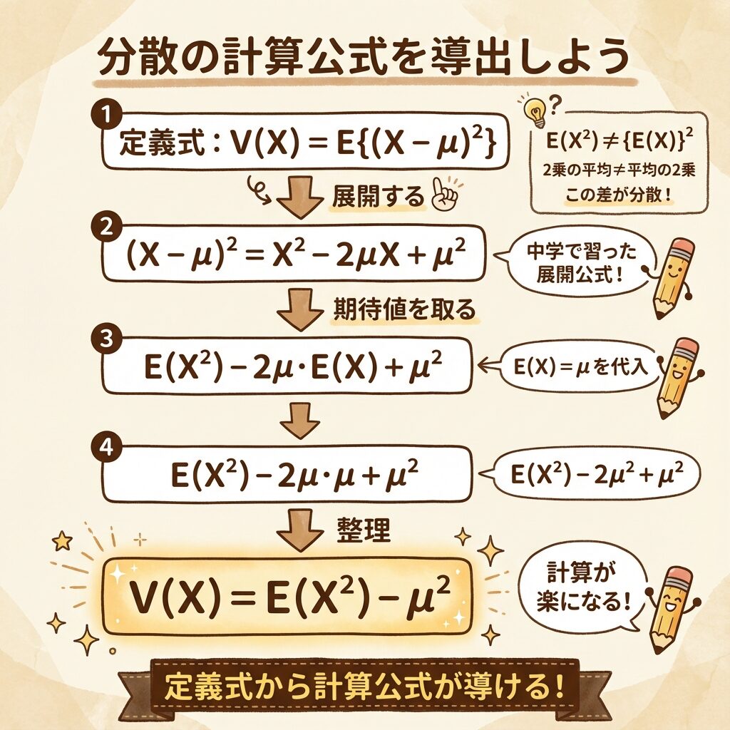 🔥 計算公式の導出|V(X) = E(X²) − μ²