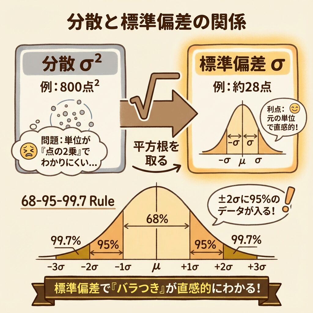 例えば、テストの点数(単位:点)の分散は「点²(点の2乗)」になります。これでは直感的にわかりにくいですよね。