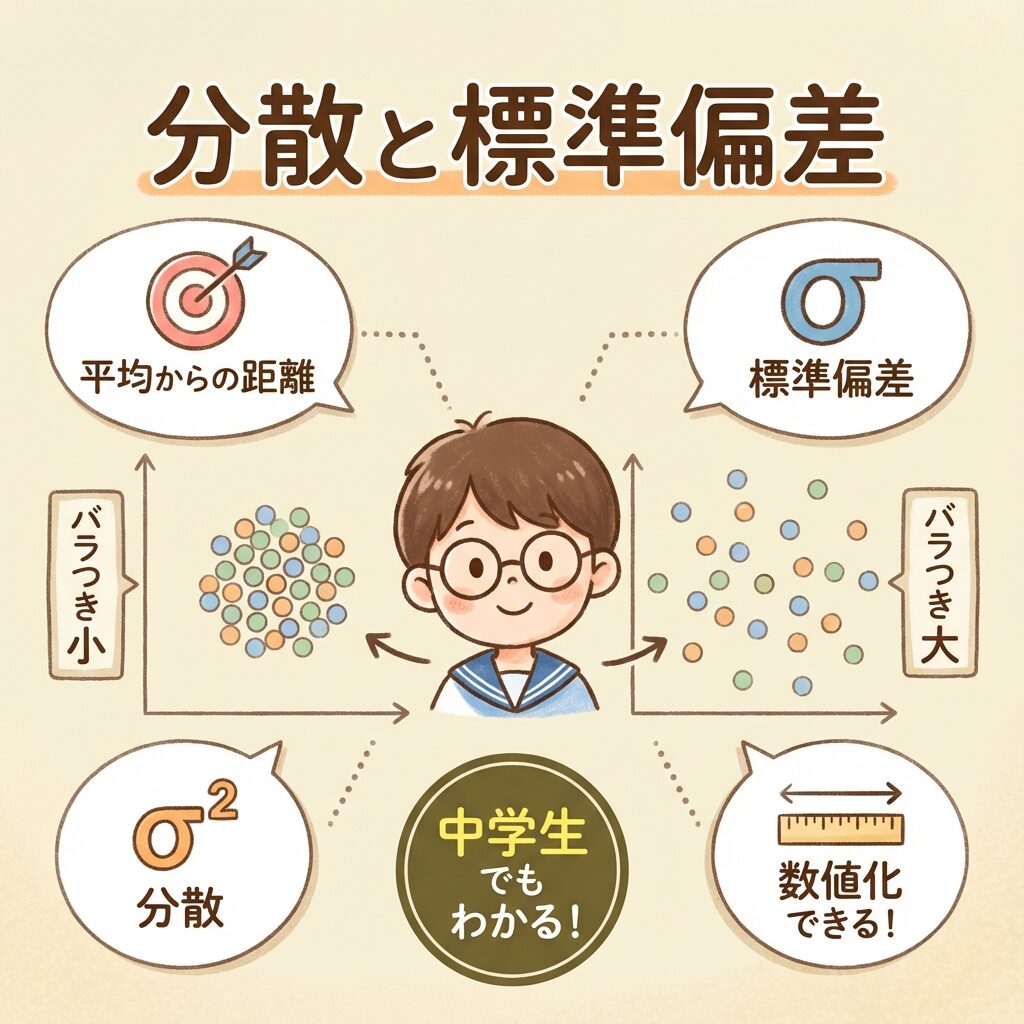 この記事では、「なぜこの公式になるのか」を徹底的に図解します。読み終わる頃には、分散と標準偏差が「当たり前」に感じられるようになります!