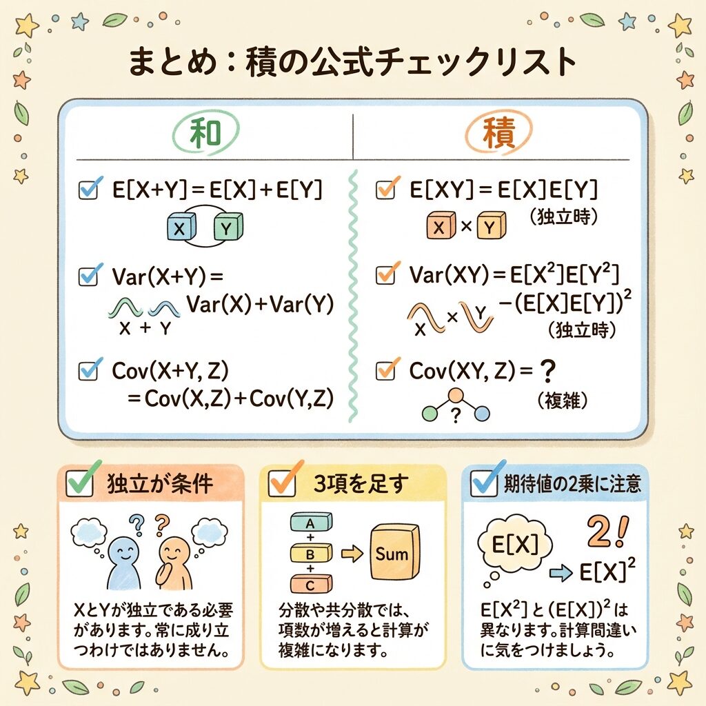 • 期待値の積:E(XY) = E(X) × E(Y)(独立なら成立)