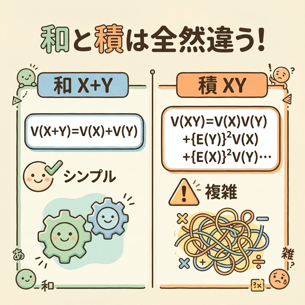 「和」の分散 V(X+Y) = V(X) + V(Y) を図解。「積」との違いが明確になります。