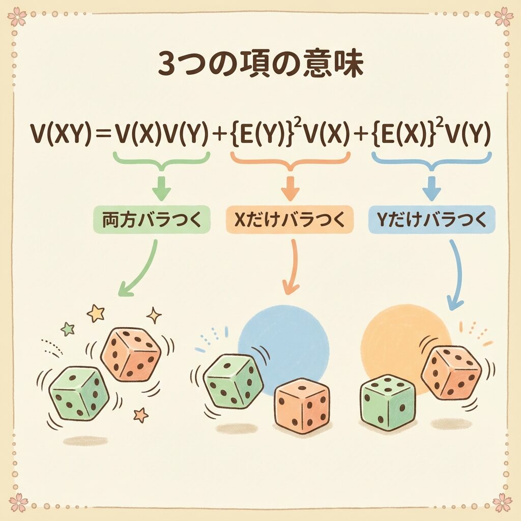 • V(XY)の3つの項は「両方バラつく」「Xだけ」「Yだけ」の影響