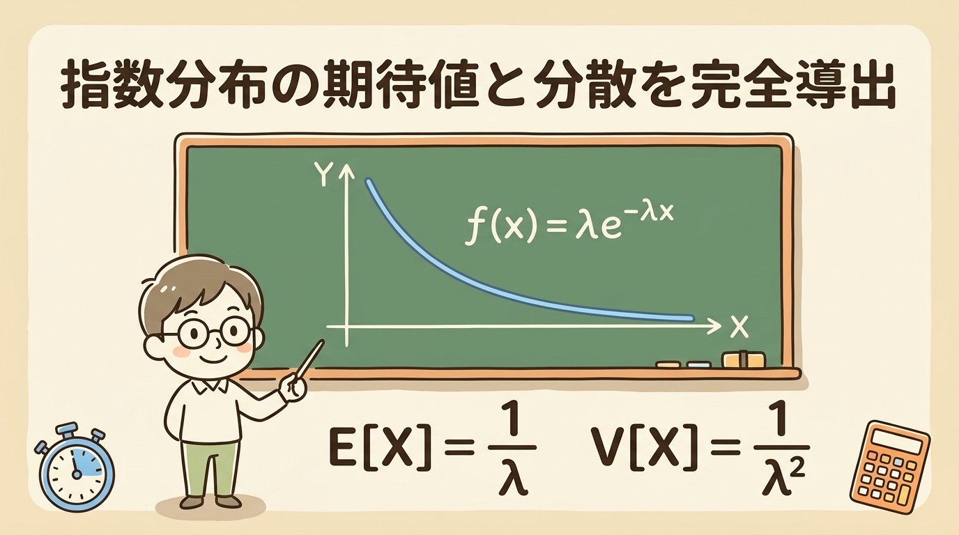指数分布の期待値と分散は、「部分積分」さえ使えれば10行以内で導出できます。丸暗記に頼るのも悪くありませんが、一度自分の手で導出しておくと、試験で「あれ、1/λだっけ?1/λ²だっけ?」と迷ったときに自力で復元できます。